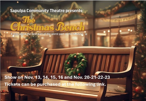 The Christmas Bench Share: Name: The Christmas Bench Date: November 20, 2025 - November 23, 2025 Website: Reserve Seats Event Description: The Christmas Bench hosted by Sapulpa Community Theatre To Current Calendar Location: 124 S. Water, Sapulpa OK 74066 Date/Time Information: Nov. 13, 14, 15 at 7:30 p.m. and 16 at 2 p.m. Nov. 20, 21, 22, at 7:30 p.m. and 23 at 2 p.m. Contact Information: Sapulpa Community Theatre Send an Email Fees/Admission: $15 per adult Set a Reminder: Enter your email address below to receive a reminder message. -- Select Days Before Event -- 1 Day 2 Days 3 Days 1 Week Captcha Validation Please complete the Captcha To Current Calendar